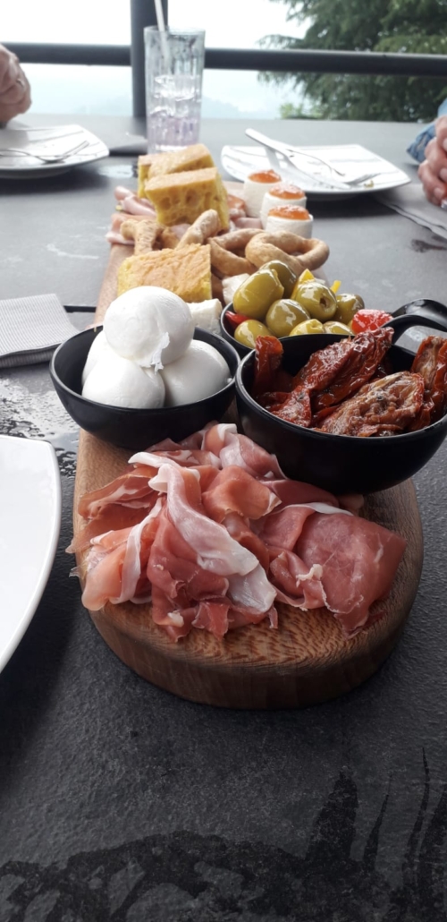 Just before driving down the hill to the city center a delicious tasting of mixed cured meat, local cheese and a good Glass of wine… With a view.
